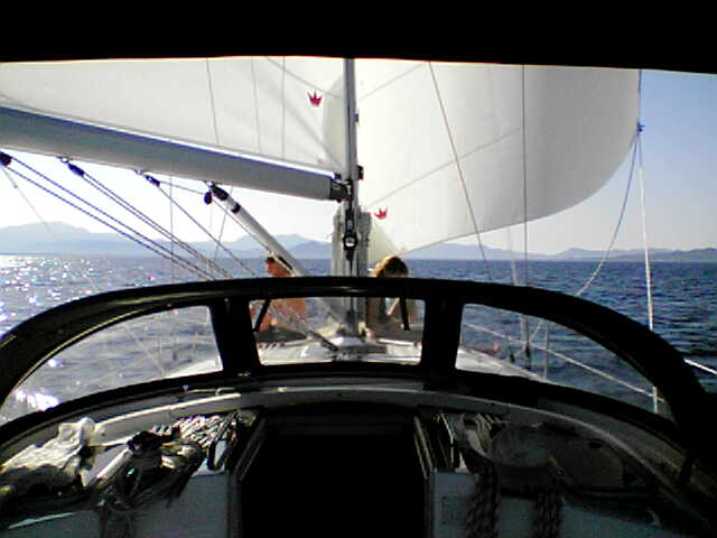 So schön kann Segeln sein! Mit achterlichem Kurs und "Schmetterling - Segeln" in der Bucht von Alcudia.